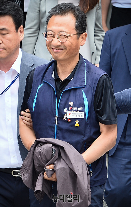 김명환 민노총 위원장이 21일 오전 서울 양천구 서울남부지방법원에서 영장실질심사를 마치고 법원을 나서고 있다.