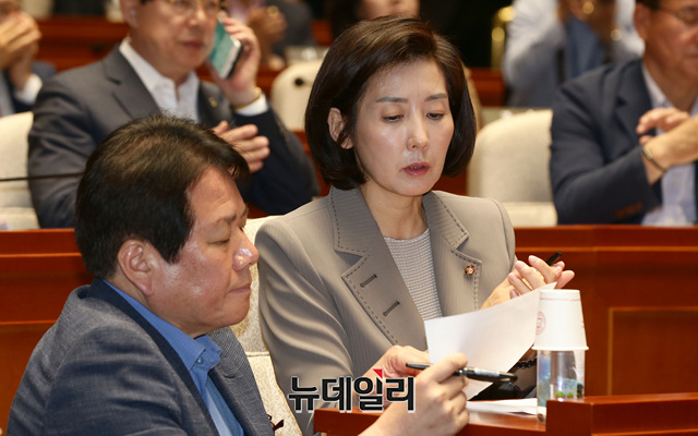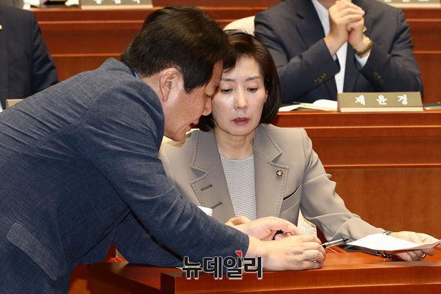 나경원 자유한국당 원내대표와 정양석 원내수석부대표가 21일 오전 국회에서 열린 '현안 및 안보 의원총회'에서 대화를 나누고 있다.