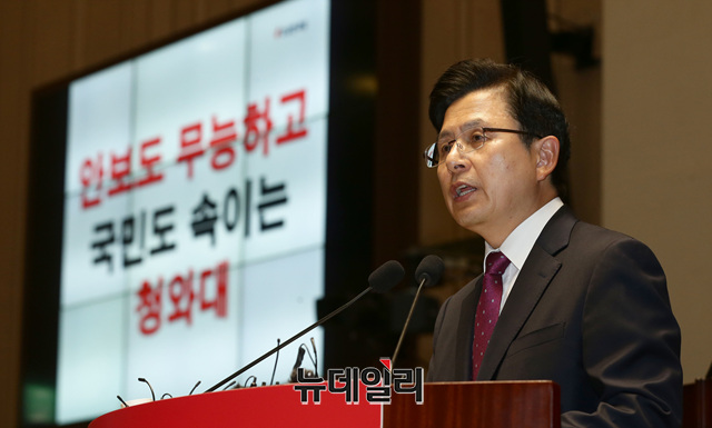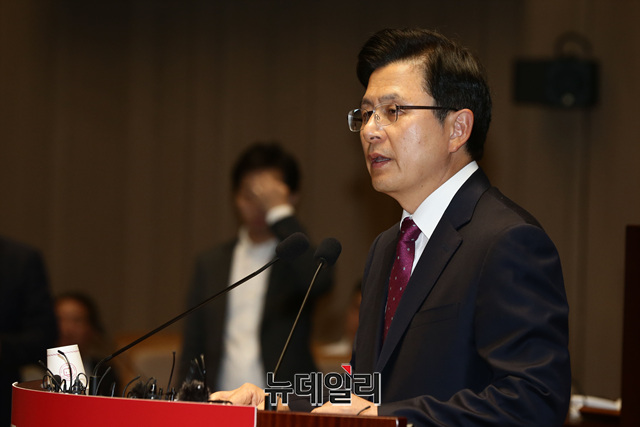 황교안 자유한국당 대표가 21일 오전 국회에서 열린 '현안 및 안보 의원총회'에서 모두발언을 하고 있다.
