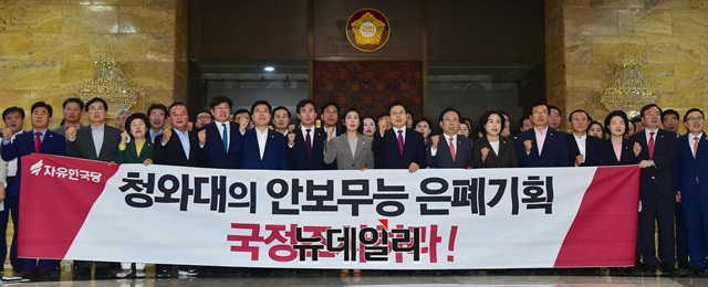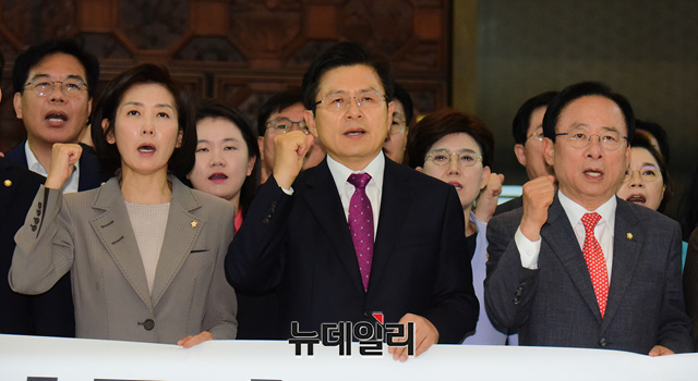 황교안 자유한국당 대표, 나경원 원내대표 등 소속의원들이 21일 오전 국회 로텐더홀에서 '북한선박 입항 은폐 및 조작 규탄' 관련 구호를 외치고 있다.