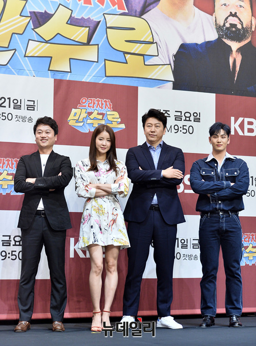 양혁PD(왼쪽부터), 스포츠해설가 박문성, 배우 이시영, 배우 김수로, 뉴이스트 백호가 21일 오후 서울 구로구 라마다 신도림호텔에서 열린 KBS 2TV 예능프로그램 '으라차차 만수로' 기자간감회에서 포토타임을 갖고 있다.