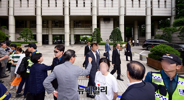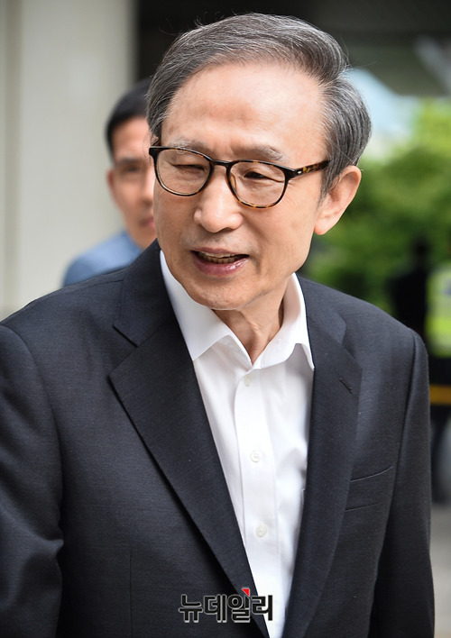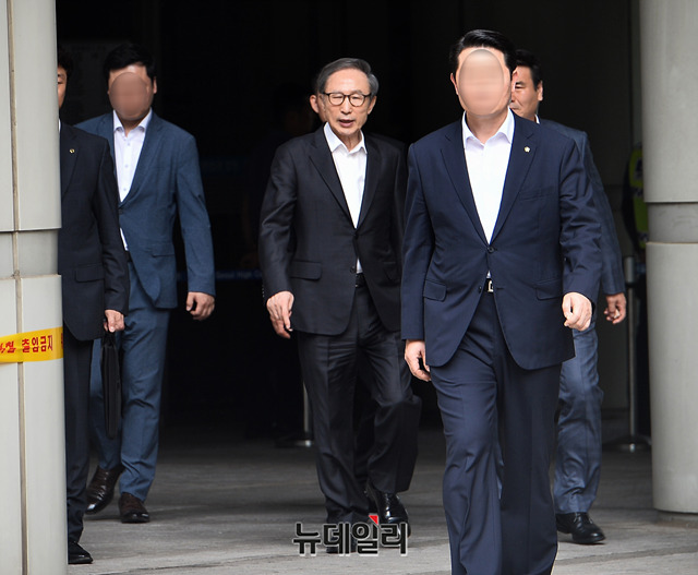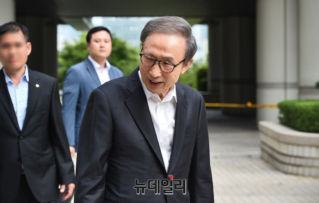 이명박 전 대통령이 21일 오후 서울 서초구 서울고등법원에서 열린 항소심 공판을 마치고 법원을 나서고 있다.