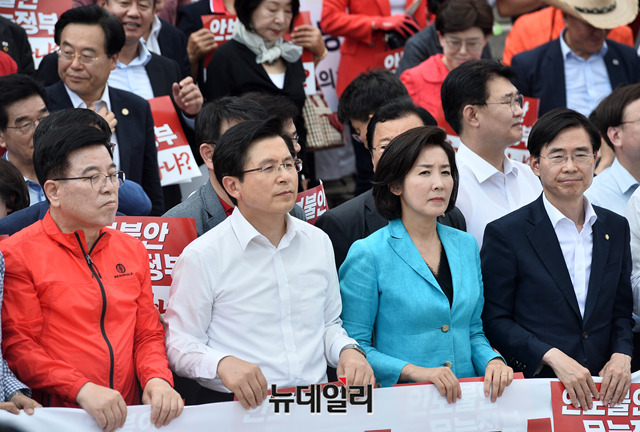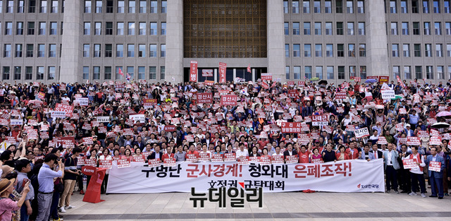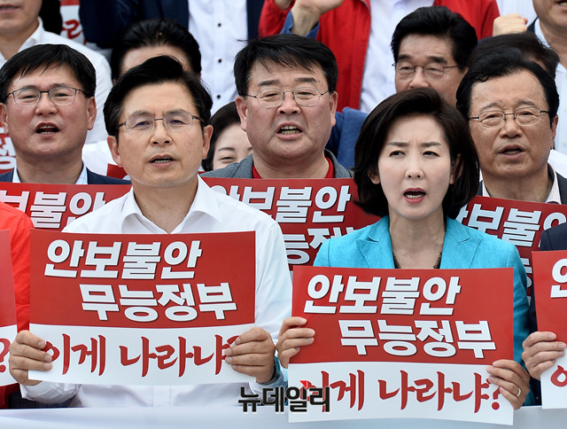 황교안 자유한국당 대표, 나경원 원내대표와 소속 의원 및 당원들이 23일 오후 국회 본관 앞 계단에서 열린 '구멍난 군사경계 청와대 은폐조작, 文정권 규탄대회'에서 피켓을 들고 구호를 외치고 있다.
