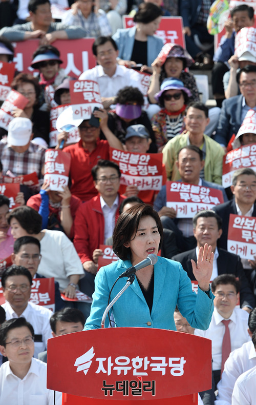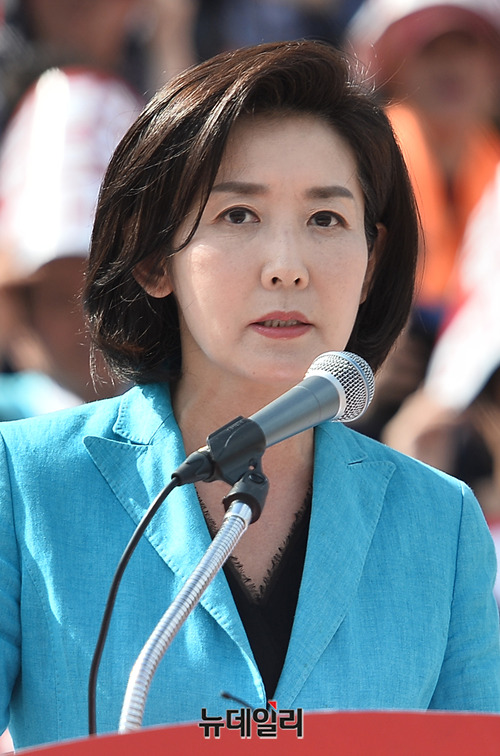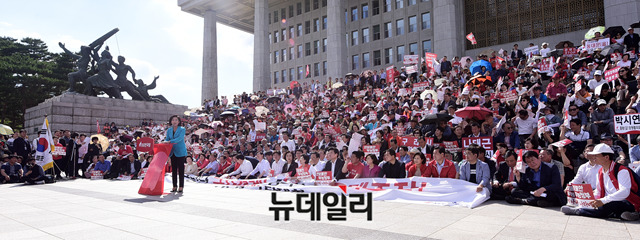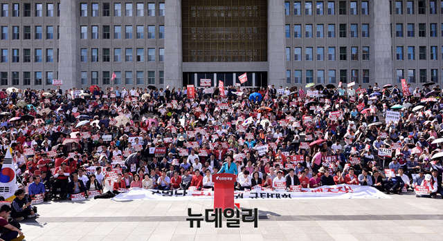 나경원 자유한국당 원내대표가 23일 오후 국회 본관 앞 계단에서 열린 '구멍난 군사경계 청와대 은폐조작, 文정권 규탄대회'에서 모두발언을 하고 있다.