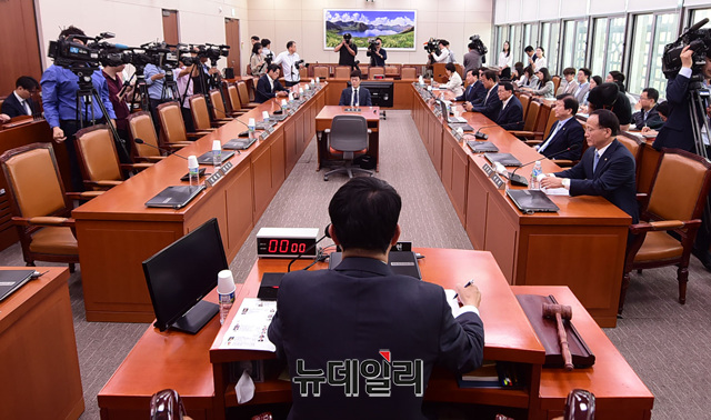 윤상현 국회 외통위원장이 24일 오전 국회에서 열린 전체회의에서 자유한국당 의원들이 불참한 가운데 회의를 주재하고 있다.