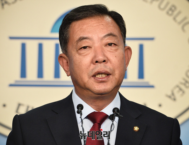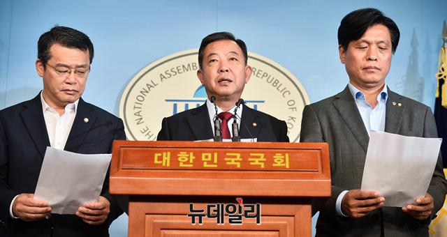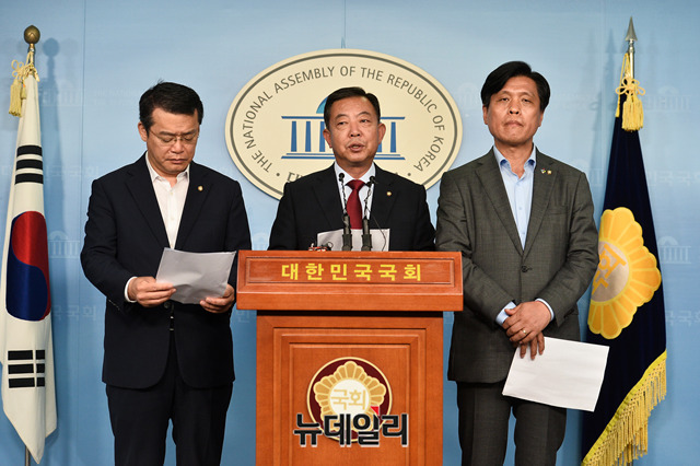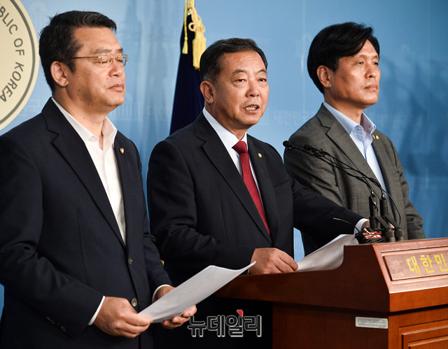 이찬열 국회 교육위원회 위원장(가운데), 임재훈 바른미래당 의원, 조승래 더불어민주당 의원이 24일 오전 국회 정론관에서 유치원 3법 관련 기자회견을 갖고 있다.