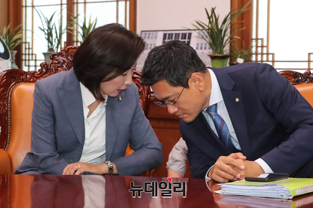 나경원 자유한국당 원내대표와 오신환 바른미래당 원내대표가 24일 오후 국회 의장실에서 열린 국회 정상화 관련 회동에서 대화를 나누고 있다.