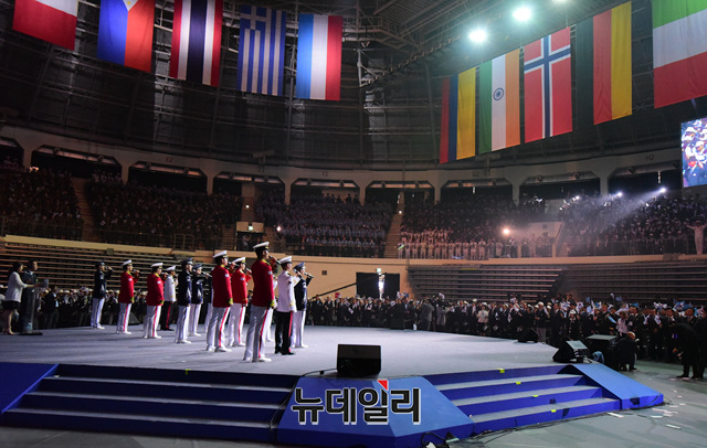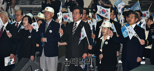 6.25참전유공자, 이낙연 국무총리, 여야 4당 대표 등 참석자들이 25일 오전 서울 중구 장충체육관에서 열린 '6.25전쟁 제69주년 기념식'에서 6.25노래를 부르고 있다.