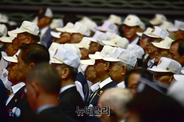 6.25참전유공자, 국군 장병, 이낙연 국무총리, 여야 4당 대표 등 참석자들이 25일 오전 서울 중구 장충체육관에서 열린 '6.25전쟁 제69주년 기념식'에서 애국가를 부르고 있다.
