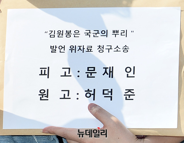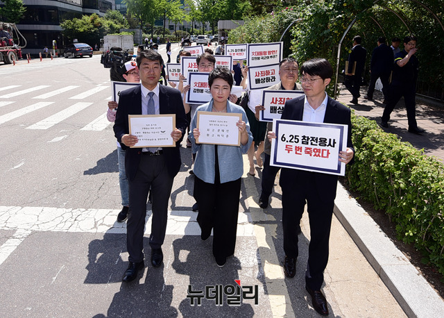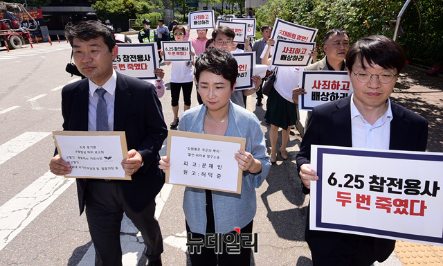 이언주 무소속 의원 및 행동하는자유시민이 25일 오후 서울 서초구 서울중앙지법 입구에서 '문재인 대통령 위자료 청구소송 기자회견' 직후 위자료 청구소송 소장, 고발장을 접수하러 법원에 입장하고 있다.이 의원 및 행동하는자유시민은 이날 기자회견에서 6일 있었던 문 대통령의 현충일 추념사를 놓고 "6.25 사변에 참전해 대한민국을 김원봉 일당으로부터 수호한 모든 장병과 그 가족들의 마음에 깊은 상처를 남겼다"며 문 대통령의 사죄와 해명을 요구하며 위자료 청구 소송을 제기했다.또한 15일 있었던 북한 목선 밀입항 사건에 대해 "정의용 국가안보실장 등은 허위 보고하도록 직무 유기·묵인·방조에 동참했다"며 군형법상 허위 보고죄로 고발했다.