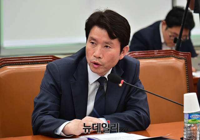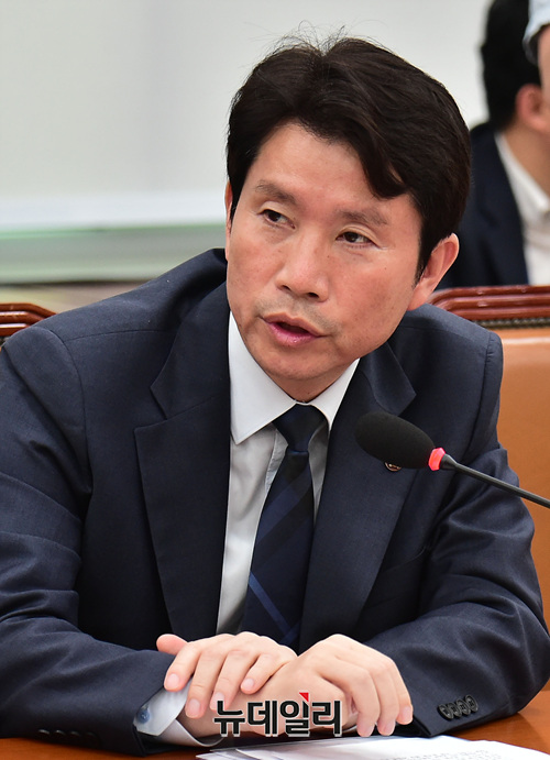 이인영 더불어민주당 원내대표가 25일 오후 국회 외교통일위원회 전체회의에 참석해 강경화 외교부 장관, 김연철 통일부 장관에게 질의를 하고 있다.