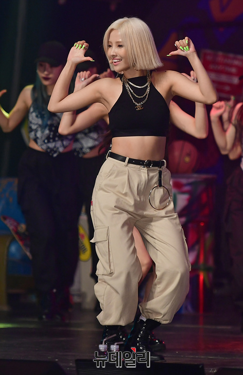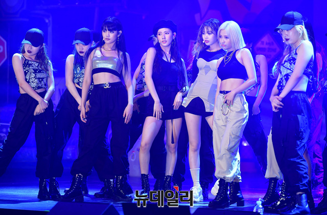 걸그룹 (여자)아이들이 26일 오후 서울 용산구 블루스퀘어에서 열린 디지털 싱클 '(Uh-Oh)' 쇼케이스에서 타이틀곡 무대를 선보이고 있다.