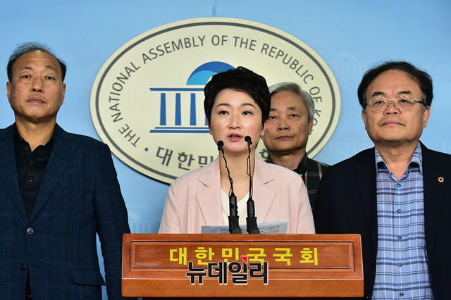 무소속 이언주 의원과 공공주택지구 전국연대 관계자들이 27일 오전 국회 정론관에서 '사유재산권 침해 정책 중단 촉구' 기자회견을 하고 있다.