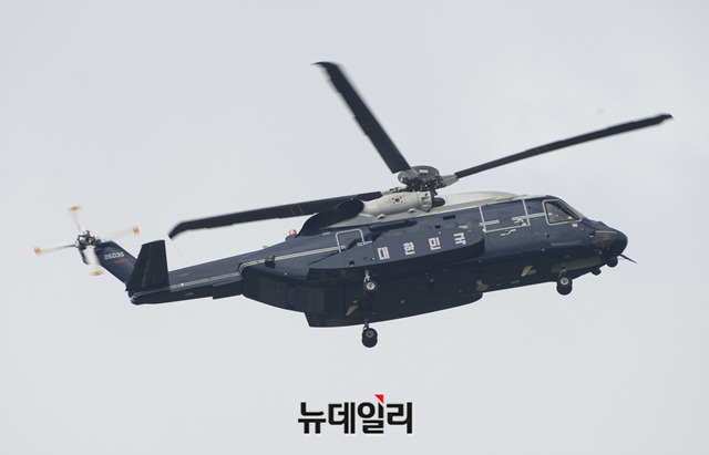 '무하마드 빈 살만(Mohammed bin Salman)' 사우디아라비아 왕세자가 탑승한 대통령 전용 헬기가 27일 오후 3시15분쯤 대전시 유성구 국방과학연구소(ADD, 사진 왼쪽)에 착륙하고 있다.'빈 살만' 왕세자가 탄 대통령 전용 헬기는 공격용 헬기 2대와 함께 이동해 1시간가량 국방과학연구소에서 머무르다 오후 4시10분쯤 이륙했다.26일 국빈방문한 '빈 살만' 왕세자는 28일부터 일본 오사카에서 열리는 주요 20개국(G20) 정상회의에 참석할 예정이다. (대전 유성=박성원 기자)