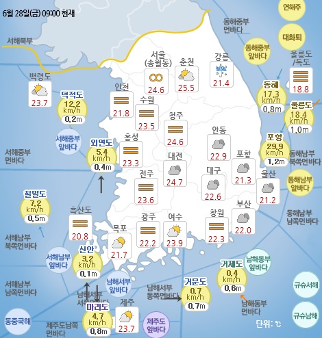 28일인 오늘 전국이 가끔 구름 많고 비가 내리는 곳이 있겠다.기상청에 따르면, 대기불안정으로 경기동부와 강원도, 충북북부, 경북내륙에 정오부터 오후 9시 사이에 천둥.번개를 동반한 소나기가 오는 곳이 있겠으며 예상 강수량은 5~40mm가 되겠다.낮기온은 23~30도의 분포를 보이며 습기로 인해 후덥지근하겠다.주말인 29일에는 다시 북상하는 장마전선의 영향으로 전국이 흐리고 오전 3시 이후 전남과 제주도를 시작으로 낮(오전 9시~오후 3시) 동안 남부지방과 충청도, 강원남부로 비가 확대되겠다. 한편, 서울과 경기도도 낮에 비가 내리는 곳이 있겠다.모레 30일은 남부지방에 위치한 장마전선의 영향을 받다가 차츰 벗어나겠다. 전국이 대체로 흐리겠고 남부지방에선 비가 오다가 오전 9시에 대부분 그치겠다.이번 주말 비가 오는 지역에서는 돌풍과 함께 천둥·번개가 치는 곳이 있겠고 특히 남부지방과 제주도의 경우 시간당 30mm 이상의 강한 비가 예상되므로 비 피해가 없도록 대비할 것을 기상청은 당부했다.