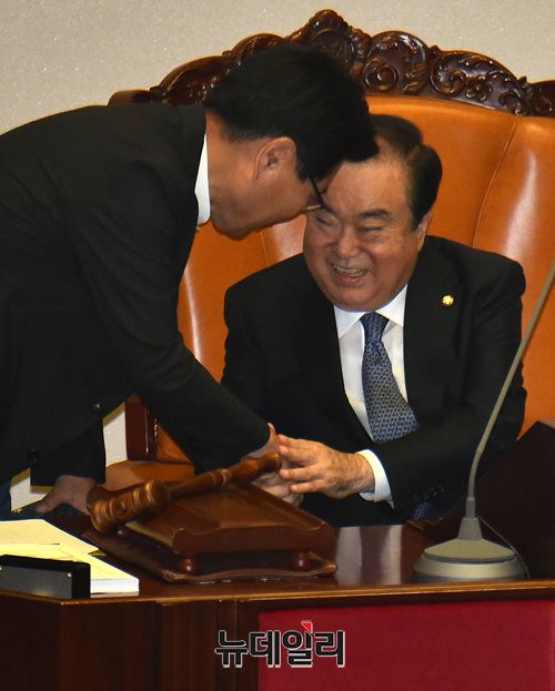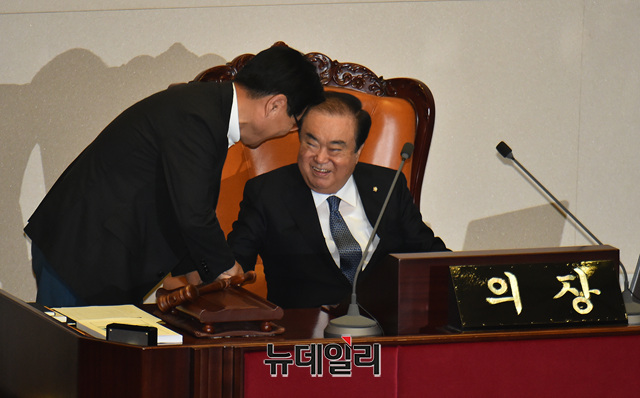 문희상 국회의장이 28일 오후 국회에서 열린 본회의에서 홍문종 우리공화당 의원과 대화를 나누고 있다.