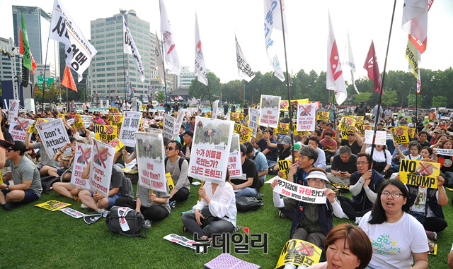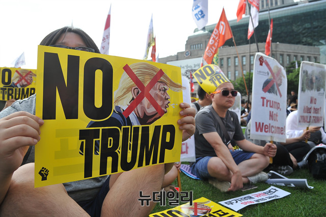 도널드 트럼프 미국 대통령의 방한이 예정된 29일 오후 민중공동행동 회원들이 서울 중구 서울광장에서 열린 'NO트럼프 범국민행동'에 참석해 트럼프 대통령을 규탄하는 피켓을 들고 있다.