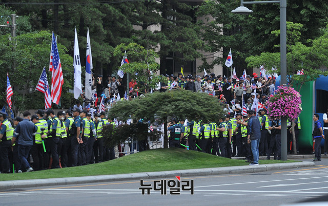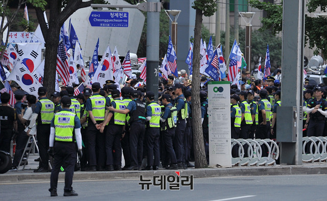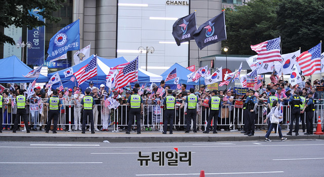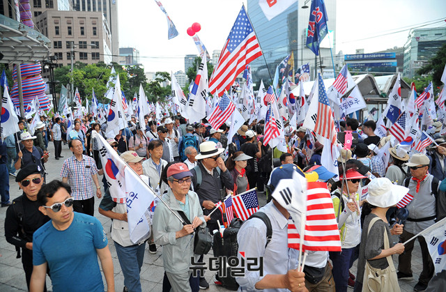 우리공화당(구 대한애국당) 지지자 및 우파단체 회원들이 29일 오후 서울 중구 청계천로에서 트럼프 미국 대통령 방한 환영 집회를 연 후 이동을 하고 있다.