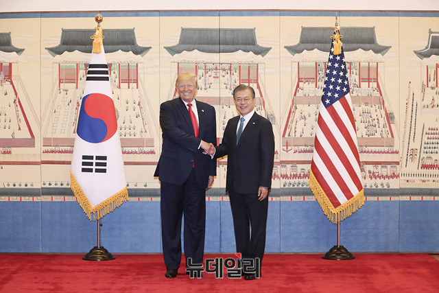 문재인 대통령과 도널드 트럼프 미국 대통령이 30일 청와대 접견실에서 방명록에 서명식을 마친 뒤 기념촬영을 하고 있다. (사진=청와대)