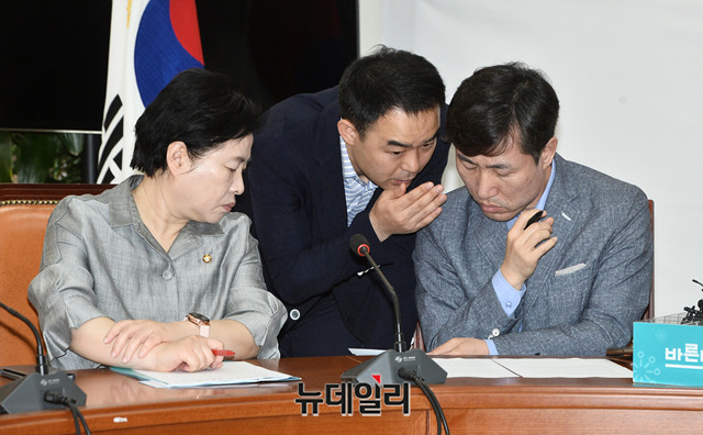 하태경 바른미래당 의원과 채이배 의원이 2일 오전 국회에서 열린 원내대책회의에서 대화를 하고 있다.