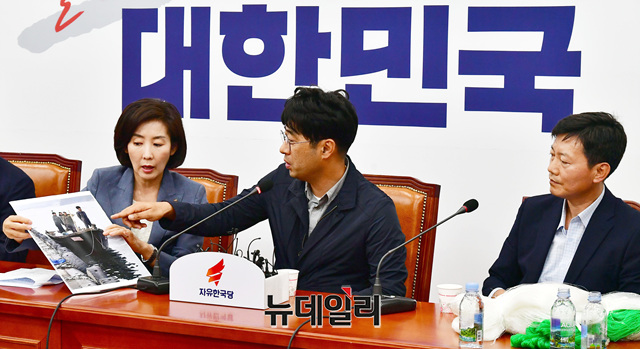 나경원 자유한국당 원내대표가 2일 오후 국회에서 열린 북한선박 입항 은폐조작 진상조사단 감담회에서 '북한 어선 삼척항 입항 사건' 최초 112 신고자 김경현씨와 촬영자 전동진 씨에게 당시 상황을 듣고 있다.