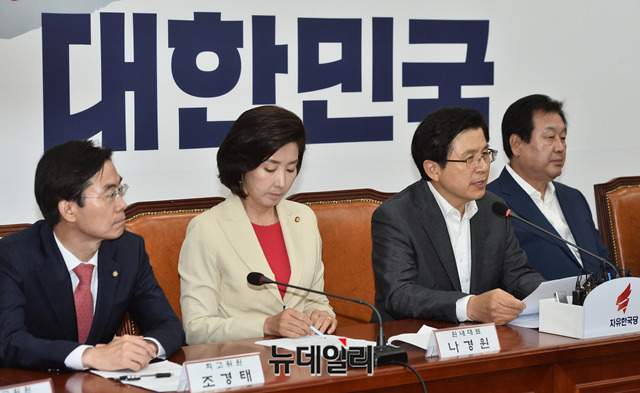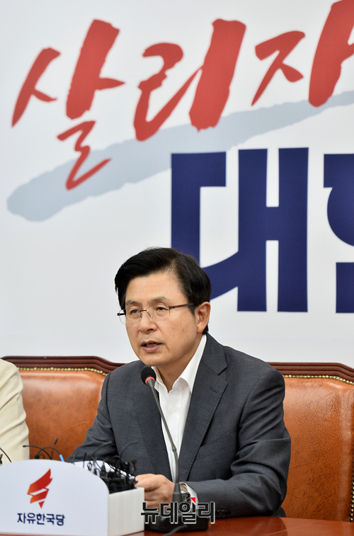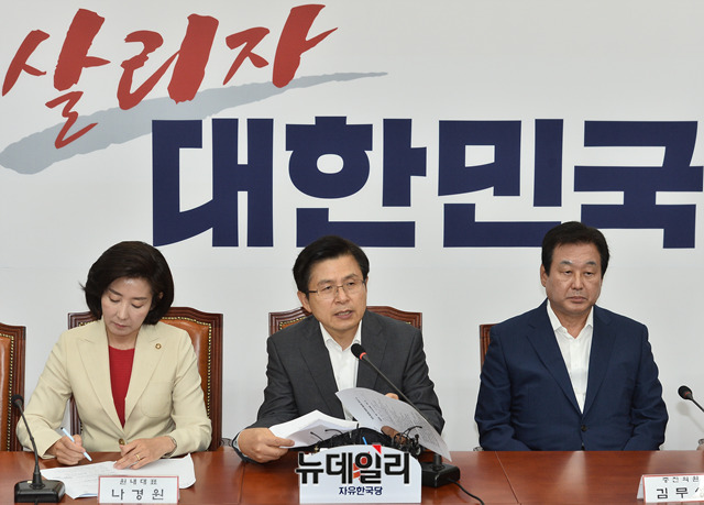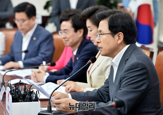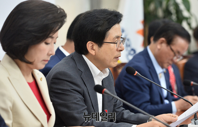 황교안 자유한국당 대표가 3일 오전 국회에서 열린 당대표 및 최고위원·중진의원 연석회의에서 모두발언을 하고 있다.