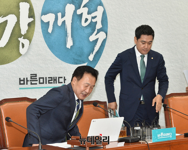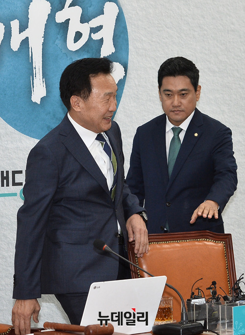 손학규 바른미래당 대표, 오신환 원내대표가 3일 오전 국회에서 열린 최고위원회의에 입장하고 있다.