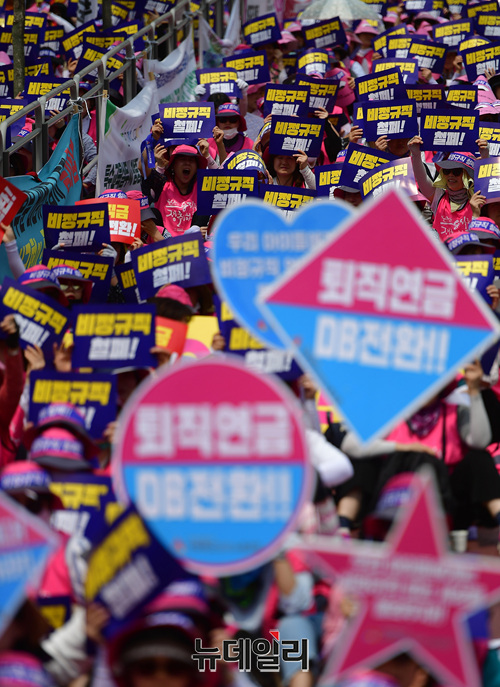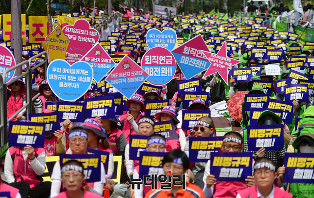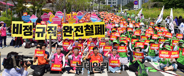 전국학교비정규직연대회의 조합원들이 3일 오전 서울 종로구 서울시교육청 앞에서 열린 총파업 출정식에서 구호를 외치고 있다. 이들은 이날 출정식에서 '비정규직 완전철폐'와 '퇴직금 DB전환' 등을 요구했다.