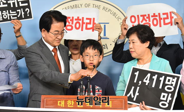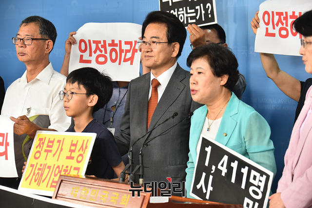 정동영 민주평화당 대표와 조배숙 의원이 가습기 살균제 피해입은 박준석 어린이와 3일 오전 국회 정론관에서 '가습기 살균제 피해구제 현실화 및 가습기 살균제 피해구제를 위한 특별법 개정 촉구 기자회견'을 갖고 있다.