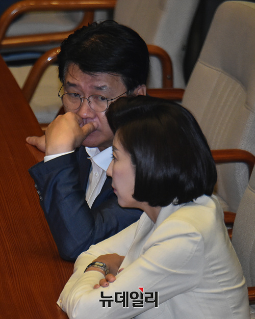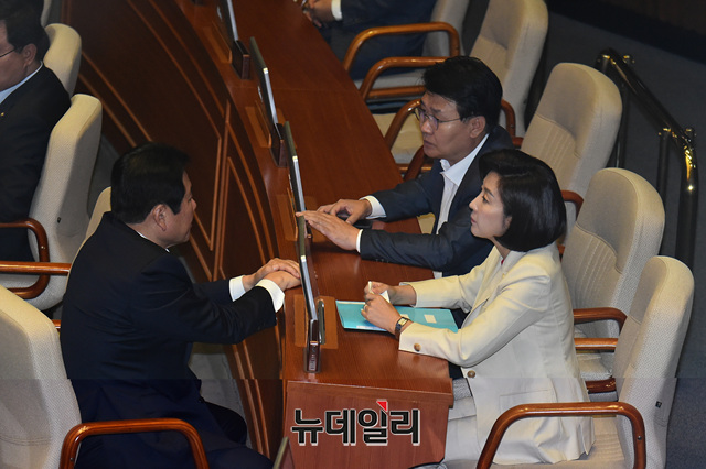 나경원 자유한국당 원내대표와 정용기 정책위의장 등이 3일 오전 국회에서 열린 본회의에서 대화를 나누고 있다.