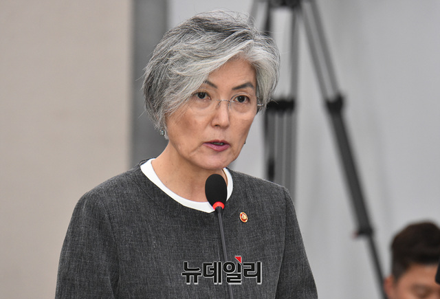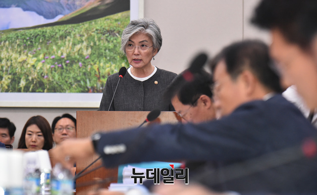 강경화 외교부장관이 3일 오후 국회에서 열린 외교통일위원회 전체회의에 출석해 현안보고를 하고 있다.