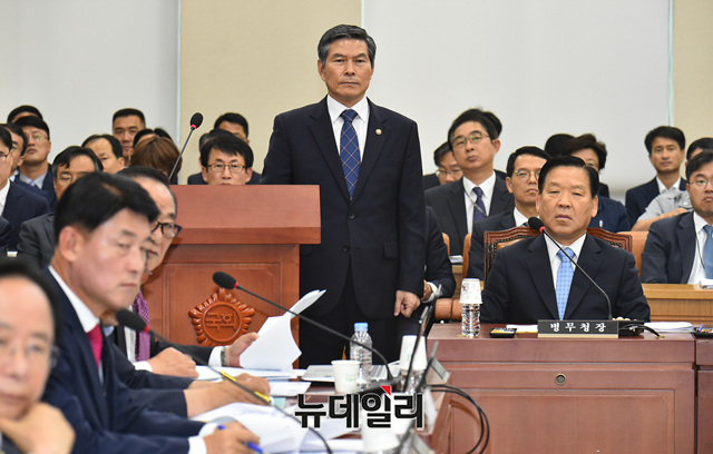 정경두 국방부 장관이 3일 오후 국회에서 열린 국방위원회 전체회의에 출석해 현안보고에 앞서 인사를 하고 있다.