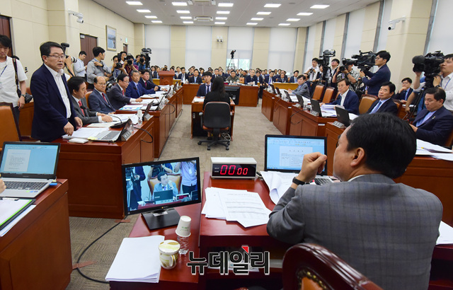 자유한국당 의원들이 3일 오후 국회에서 열린 국방위 전체회의에서 정경두 국방부 장관이 북한 목선 관련 현안보고를 하고 있는 도중 "안규백 위원장이 의사진행 발언 기회를 안준다"며 회의장을 떠나고 있다.