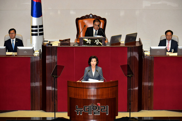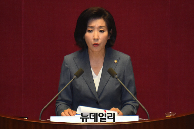 나경원 자유한국당 원내대표가 4일 오전 열린 국회 본회의에서 교섭단체 대표연설을 하고 있다.