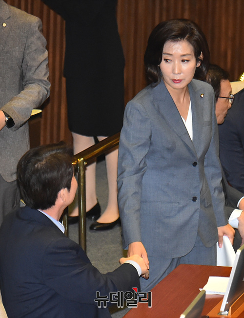나경원 자유한국당 원내대표가 4일 오전 열린 국회 본회의에서 교섭단체 대표연설을을 위해 단상으로 향하는 중 이인영 더불어민주당 원내대표와 악수를 나누고 있다.