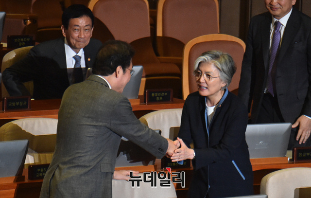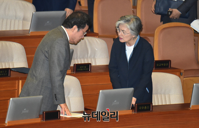 이낙연 국무총리와 강경화 외교부 장관이 4일 오전 국회에서 열린 본회의에 참석해 대화를 나누고 있다.