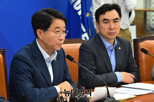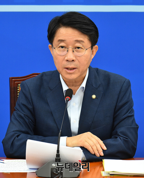조정식 더불어민주당 정책위의장이 4일 오전 국회 원내대표실에서 열린 정책조정회의에서 모두발언하고 있다.