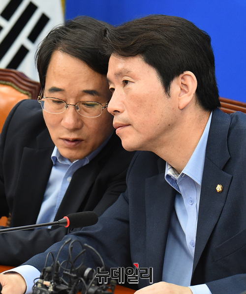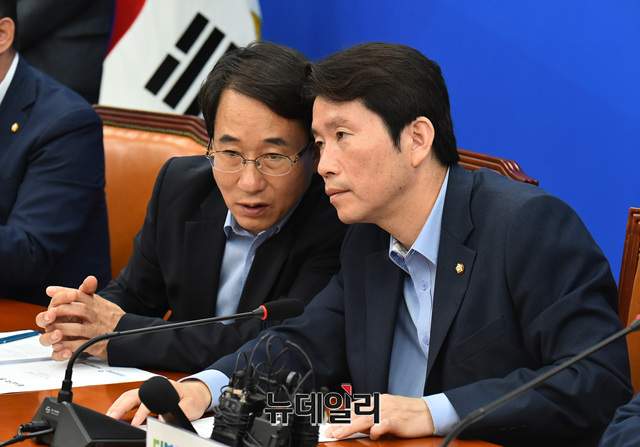 이인영 더불어민주당 원내대표가 4일 오전 국회 원내대표실에서 열린 정책조정회의에 참석해 이원욱 원내수석부대표와 대화를 나누고 있다.