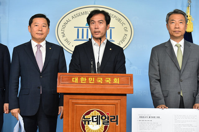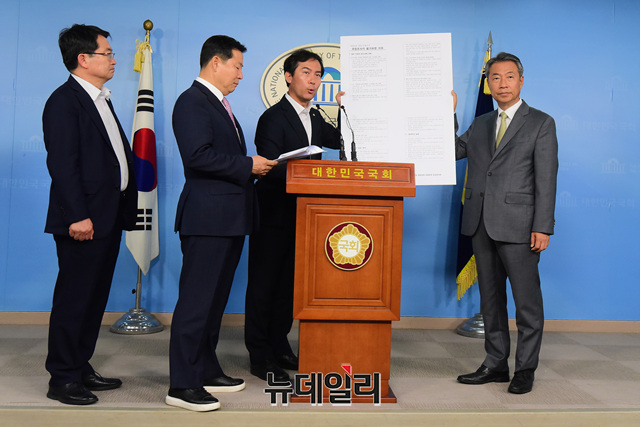 자유한국당 북한 선박 입항 은폐·조작 진상조사단 김영우 단장과 소속 의원들이 4일 오후 국회 정론관에서 기자회견을 갖고 북한 선박 의혹의 국정조사 필요성을 설명하고 있다. (왼쪽부터 백승주, 이철규, 김 단장, 정종섭 의원)