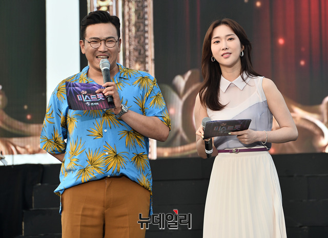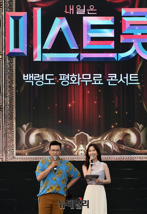 MC 딩동, 가수 조승희가 4일 오후 인천 옹진군 백령도에서 열린 '미스트롯 백령도 평화 콘서트'에서 출연가수를 소개하고 있다.