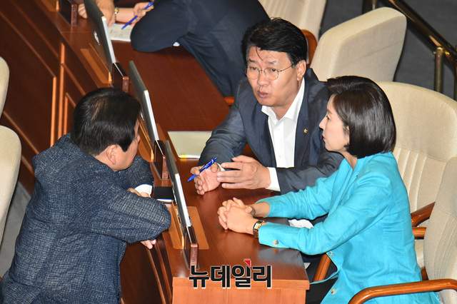 나경원 자유한국당 원내대표가 5일 오전 국회에서 열린 본회의에서 정용기 정책위의장, 정양석 원내수석부대표와 대화를 나누고 있다.