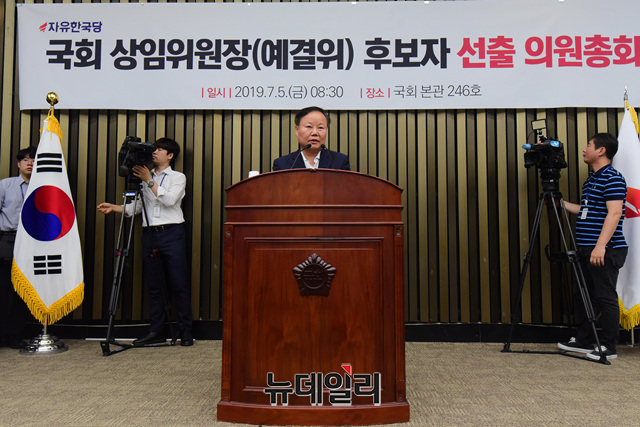 5일 오전 국회에서 열린 자유한국당의 국회 예산결산특별위원장 후보자 선출을 위한 의원총회에서 위원장 후보로 선출된 김재원 의원이 당선 소감을 밝히고 있다.