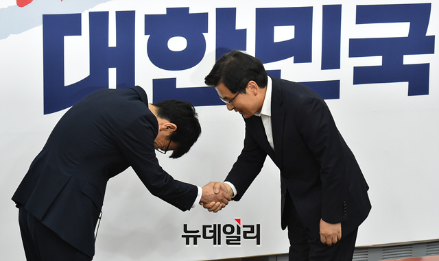 김상조 청와대 정책실장이 5일 오후 국회를 찾아 황교안 자유한국당 대표를 예방하고 악수를 나누고 있다.
