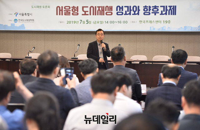 이명훈 한국도시재생학회장이 5일 오후 서울 중구 한국프레스센터에서 열린 '서울형 도시재생 성과와 향후과제' 토론회에서 '도시재생의 세계적 흐름'을 주제로 발표하고 있다.이날 토론회는 이 학회장을 비롯해 김이탁 국토교통부 도시재생사업기획단 단장, 양용택 서울시 재생정책기획관이 각각 주제발표를 맡았다.이어진 토론에는 이충기 서울시 도시재생명예시장의 사회로 박연신 한국경제신문 건설부동산 전문기자, 신정호 서울시의회 도시계획관리위원회 위원, 이용건 서울주택도시공사 도시재생본부장, 이제선 연세대학교 도시공학과 교수, 장남종 서울연구원 도시재생연구센터장이 토론자로 참여했다.