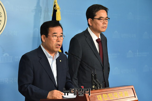 자유한국당 박성중·곽상도 의원이 8일 오전 국회 정론관에서 '문재인 대통령 사위' 관련 기자회견을 갖고 있다.