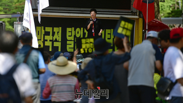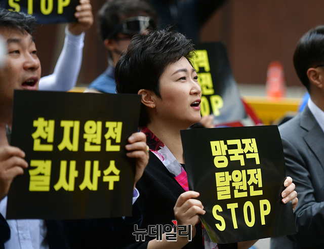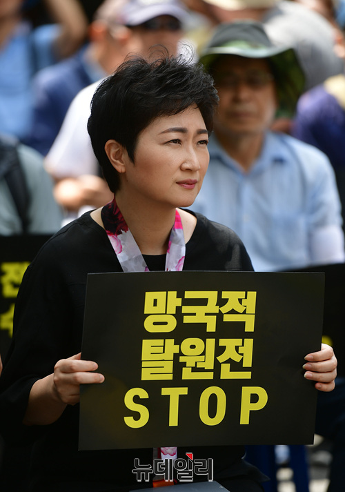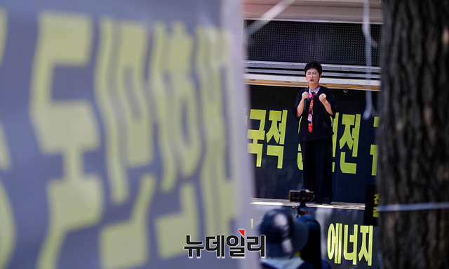 이언주 행동하는자유시민 공동대표가 8일 오후 서울 종로구 효자치안센터 앞에서 열린 탈원전 반대, 천지원전 불법고시해제 결사저지 결의대회에서 발언하고 있다.천지원전비상대책위원회, 행동하는자유시민, 자유연대, 턴라이트, 자유대한호국단 등이 공동 주최한 이날 집회에서 이들은 성명을 통해 △'망국적 탈원전' 즉각 중단 △천지원전 1,2호기 고시해제 중단 △신한울원전 3, 4호기 건설 재개 △탈원전 정책실패, 한전과 국민에게 전가하지 말것 등을 요구했다.