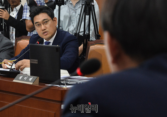 오신환 바른미래당 원내대표가 8일 오후 국회 법제사법위원회에서 열린 윤석열 검찰총장 후보자 인사청문회에서 윤 후보에게 질문을 하고 있다.