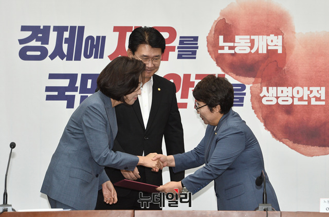 나경원 자유한국당 원내대표, 정용기 정책위의장이 9일 오전 국회에서 열린 '에너지 정책 파탄 대책 특위, 생명 안전 뉴딜 특위, 노동 개혁 특위 임명장 수여식'에서 임이자 노동 개혁 특위 간사에게 임명장 전달 직후 기념촬영을 하고 있다.