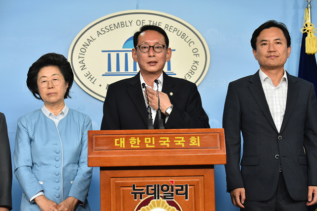 자유한국당 소속 법사위원들이 9일 오전 국회 정론관에서 윤석열 검찰총장 후보자의 자진사퇴를 요구하는 기자회견을 하고 있다. (왼쪽부터 주광덕, 이은재, 김진태 의원, 김도읍 법사위 간사, 정점식 의원.)