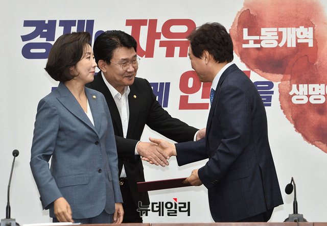 나경원 자유한국당 원내대표, 정용기 정책위의장이 9일 오전 국회에서 열린 '에너지 정책 파탄 대책 특위, 생명안전 뉴딜 특위, 노동 개혁 특위 임명장 수여식'에서 박완수 생명 안전 뉴딜 특위 부위원장에게 임명장 전달 직후 기념촬영을 하고 있다.